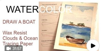 A fun lesson on drawing a figure 8 boat, but also, how to accomplish graduated washes, using kleenex to lift clouds, using candles for resist, painting a wet on wet ocean, drawing on tracing paper, and adding value to pop your painting. Click here